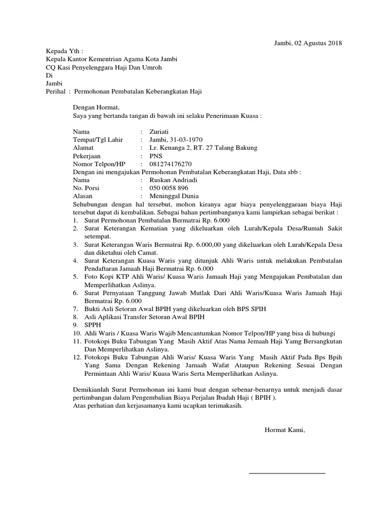 Surat persetujuan dan perjanjian penjualan tanah warisan diatas bisa ditambah keterangan lain sesuai kebutuhan. Desa gedangan kecamatan sidayu kabupaten. Perlu ada surat keterangan waris atau skhw untuk melakukan proses pindah nama aset. Oleh karena itu, bagi anda yang belum mempunyai surat ini untuk segera bisa mengurusnya ke pihak yang berwenang. Contoh surat pembatalan haji ke kementrian agamafull description. Surat keterangan ahli waris ini sebenarnya sangatlah penting untuk membuktikan bahwa seseorang memang benar ahli waris yang sah dari pewaris. Contoh pengajuan pembatalan haji dan penarikan saldo tabungan haji. Contoh surat kesepakatan untuk menjual warisan berupa rumah. Namun untuk mendapatkan penetapan ahli waris, tidak dapat begitu saja dibuat oleh ahli warisnya namun harus terlebih dahulu memperoleh penetapan mengenai ahli waris; Contoh penulisan surat kuasa via wintterlaw.com. Contoh surat ahli waris dari notaris suratmenyurat net. Contoh surat keterangan kesepakatan para ahli waris atas pembagian harta warisan dari harta yang meninggalkan (ayah). Sebagai informasi, surat keterangan waris ini bisa digunakan untuk keperluan lain seperti mengklaim asuransi, mengambil barang yang tersimpan di kantor dan sebagainya.
